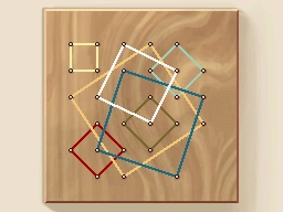 Spanne Schnüre um die Nägel, so dass einzelne Quadrate entstehen. Sie müssen nicht alle gleich groß sein. Du darfst aber jeden Nagel nur für ein Quadrat verwenden.